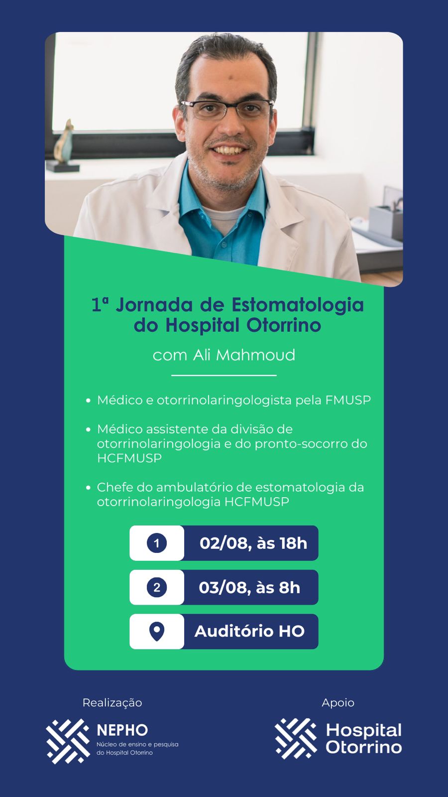 Com Dr. Ali Mahmoud: - Médico Otorrinolaringologista pala FMUSP; - Médico assistente de divisão de Otorrinolaringologia e do pronto-socorro do HCFMUSP; - Chefe do ambulatório de estomatologia da Otorrinolaringologia HCFMUSP;